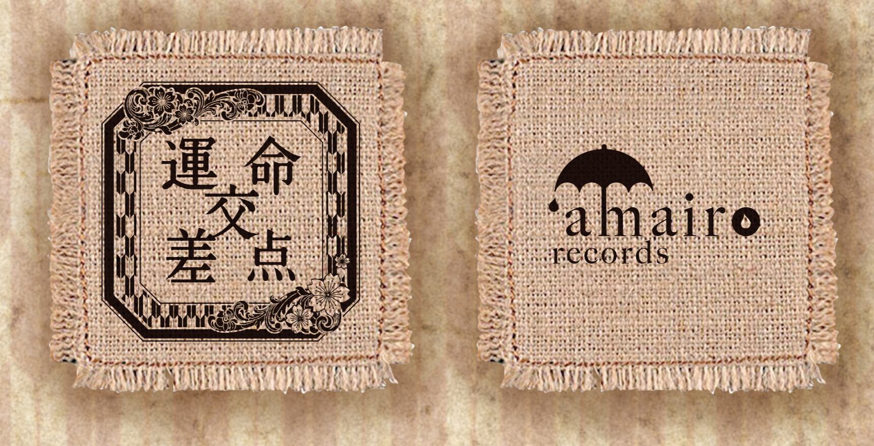 運命交差点ロゴとamairorecordsロゴをプリントした2枚1組麻製のコースターです。